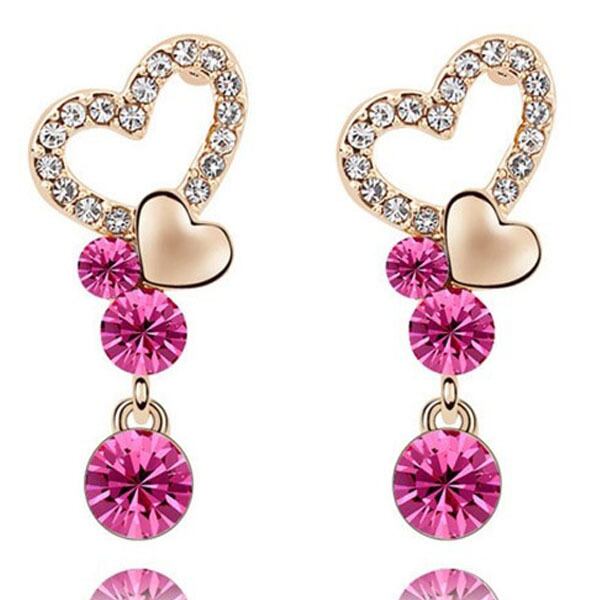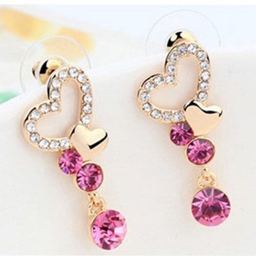 新品 ゴールド加工 ロマンチックなハートの下に連なるピンクスリーCZピアス