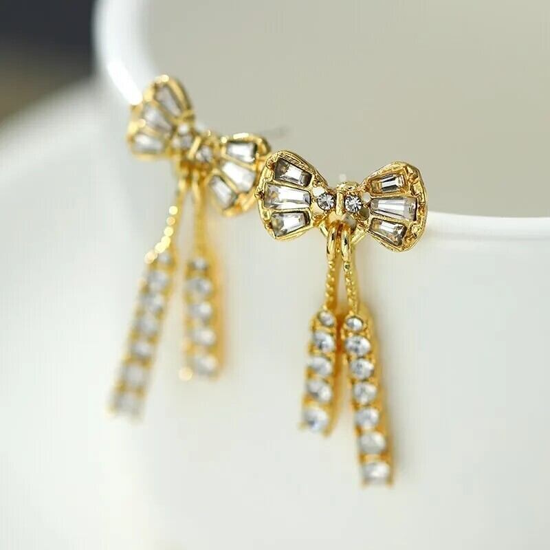 ★新品 ゴールド加工 揺れるスティック可愛いリボン クリスタルピアス